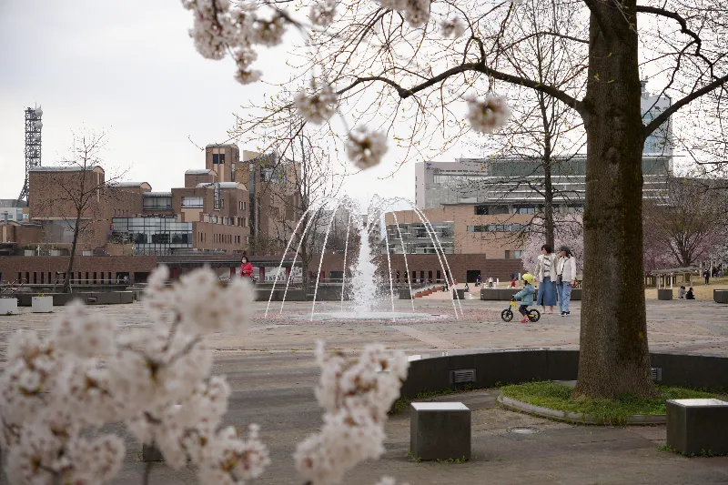 富山駅から北へ約5分ほどサイクリングすると、富岩運河環水公園に到着します。ここは富山市の人気スポットで、約200本の桜が運河を取り囲むように植えられています。